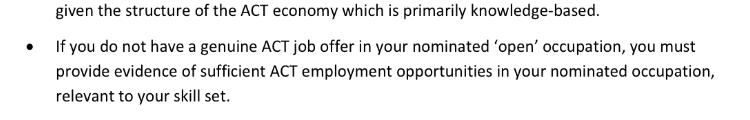 • You are eligible to apply for ACT 190 nomination if your nominated occupation is listed as ‘open’ on the current ACT Occupation List.