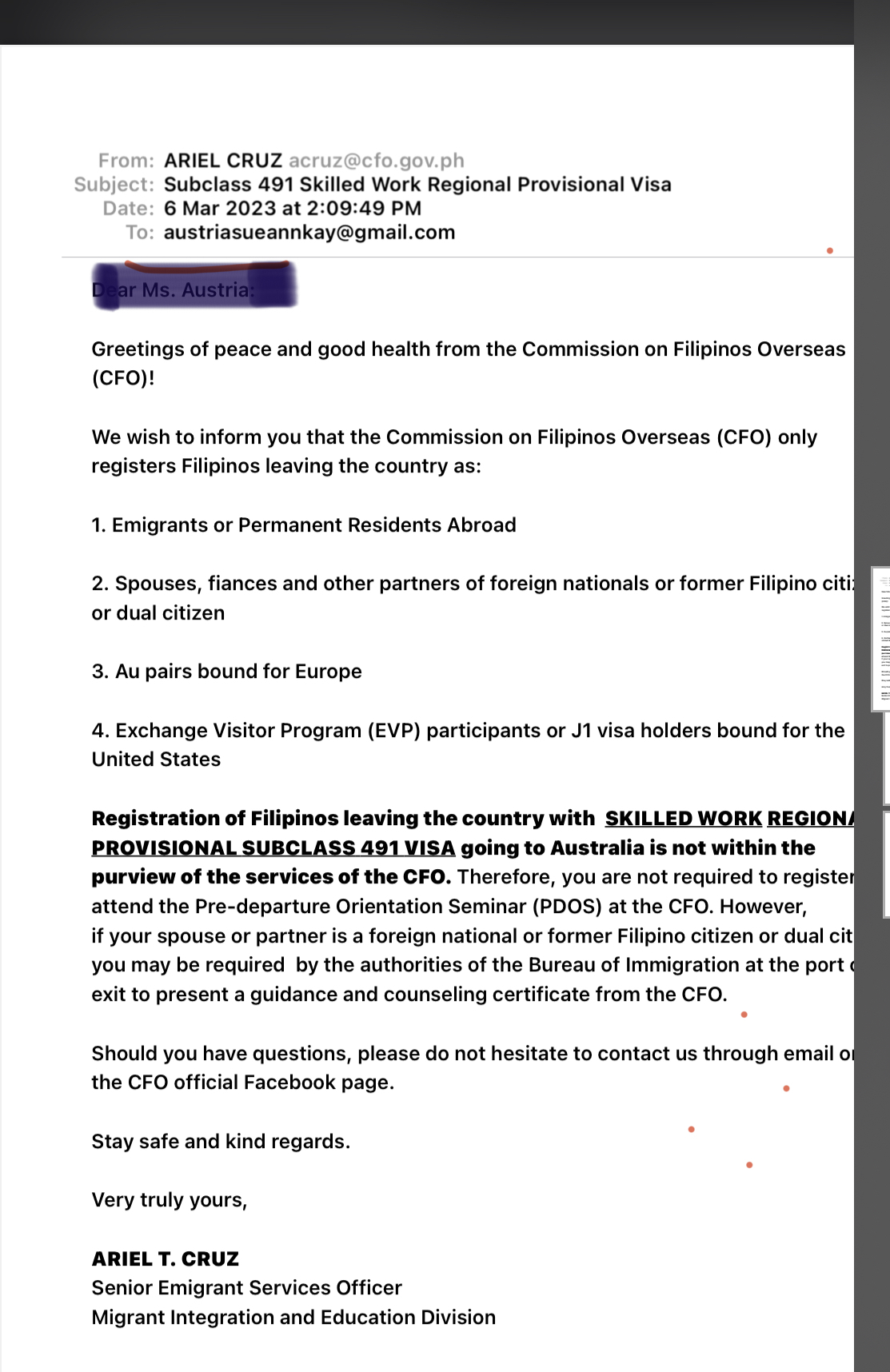 I can confirm na no need ang OEC para sa 491 visa holders kasi nagemail ako sa kanila. No need. You can just email them then print it para just in case hanapan ka, meron ka hard copy.