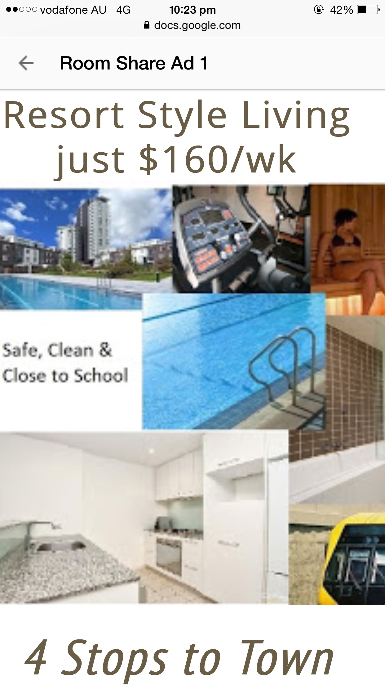 Our spacious room is furnished with 3 beds, 1 desk & chair plus 3 built in wardrobes and ample storage space along with a private bathroom. Our luxury apartment is neat and tidy, fully furnished with swimming pool, Sauna and Gymnasium. Woolworths supermarket is downstairs and it is a very safe arrangement for any young lady to stay.