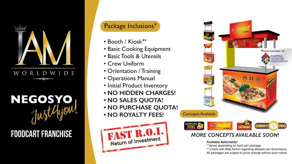 To all my kababayan na gusto pa rin magkarun ng sariling negosyo o tumulong sa mga kamag anak na magkarun ng pagkakakitaan sa pinas, pwede na po kayong mag avail ng abot kayang food cart franchise business plus an additional business program with only small capital and a fast return on investment.