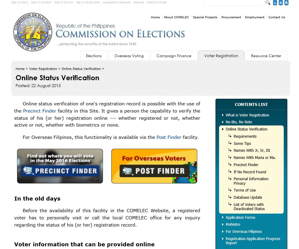 Online status verification of one's registration record is possible with the use of the Precinct Finder facility in this Site. It gives a person the capability to verify the status of his (or her) registration online --- whether registered or not, whether active or not, whether with biometrics or none.