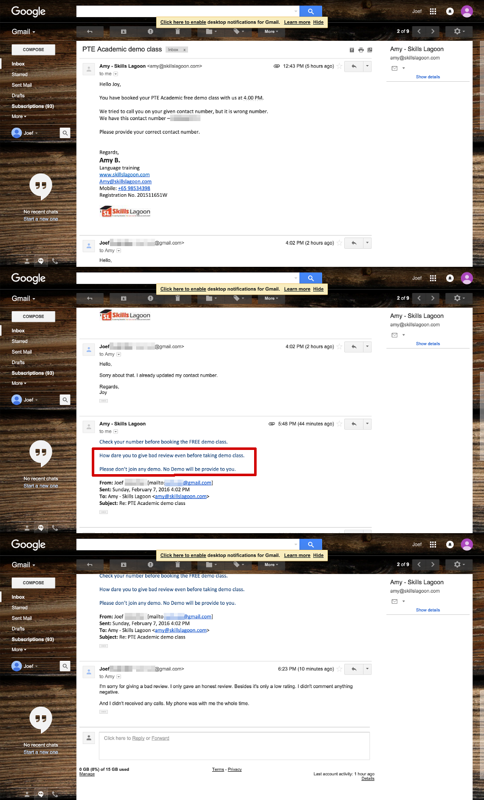 a person named Amy (amy@skillslagoon.com) emailed me. She was quite rude to me just because I gave a low rating.