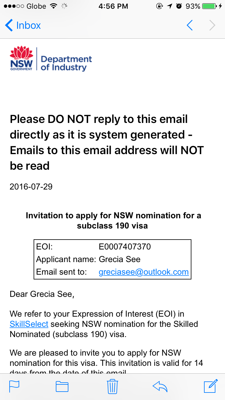 yung email na na-receive mo is invitation to apply for NSW SS kaya hindi pa na-update EOI mo.. meron ka 14days to apply dun sa link na nakalagay sa email, pay the processing fee, and upload the required docs.. then i-evaluate nila yung application mo and pag na-approve na, dun pa lang mag-update yung EOI mo for invitation to apply for visa 190 :) tingin ko, ma-invite ka na rin naman for visa 189 sa Aug 3, so less hassle na yung visa 189 for you -- di mo na kelangan dumaan sa NSW SS application (mine took 2 weeks) and ma-save mo na rin yung 300aud na SS fee.. congrats again! :)