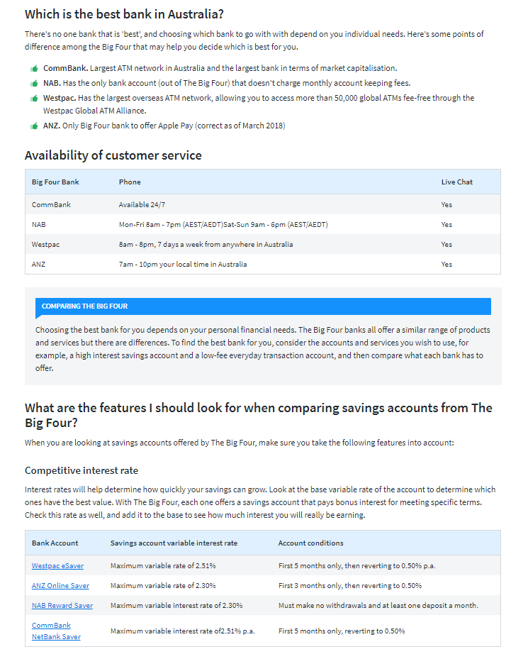 I attached a comparison of the Big Four Banks from https://www.finder.com.au/savings-accounts/big-four-banks.