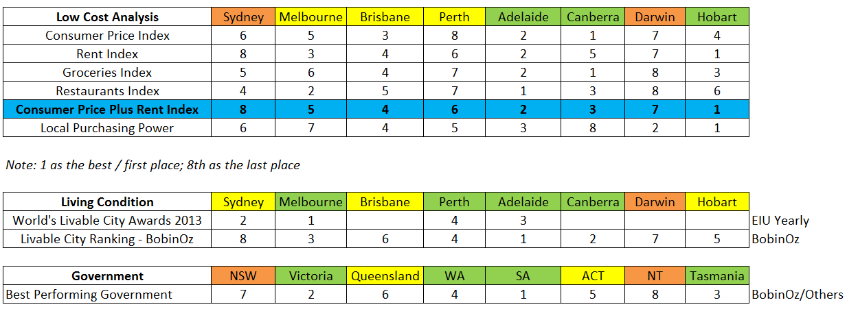 Cost of living: rental cheapest sa Adelaide, work for Asians and hindi management positions mas marami sa Brisbane, kung mining ka naman or tractor etc sa Perth ka na, kung gusto mong masira ang savings mo at matagalan ka bago makanap ng work e magSydney ka as of this writing ha not sure in the following quarters.